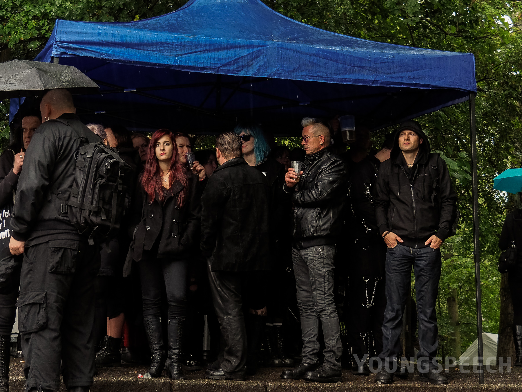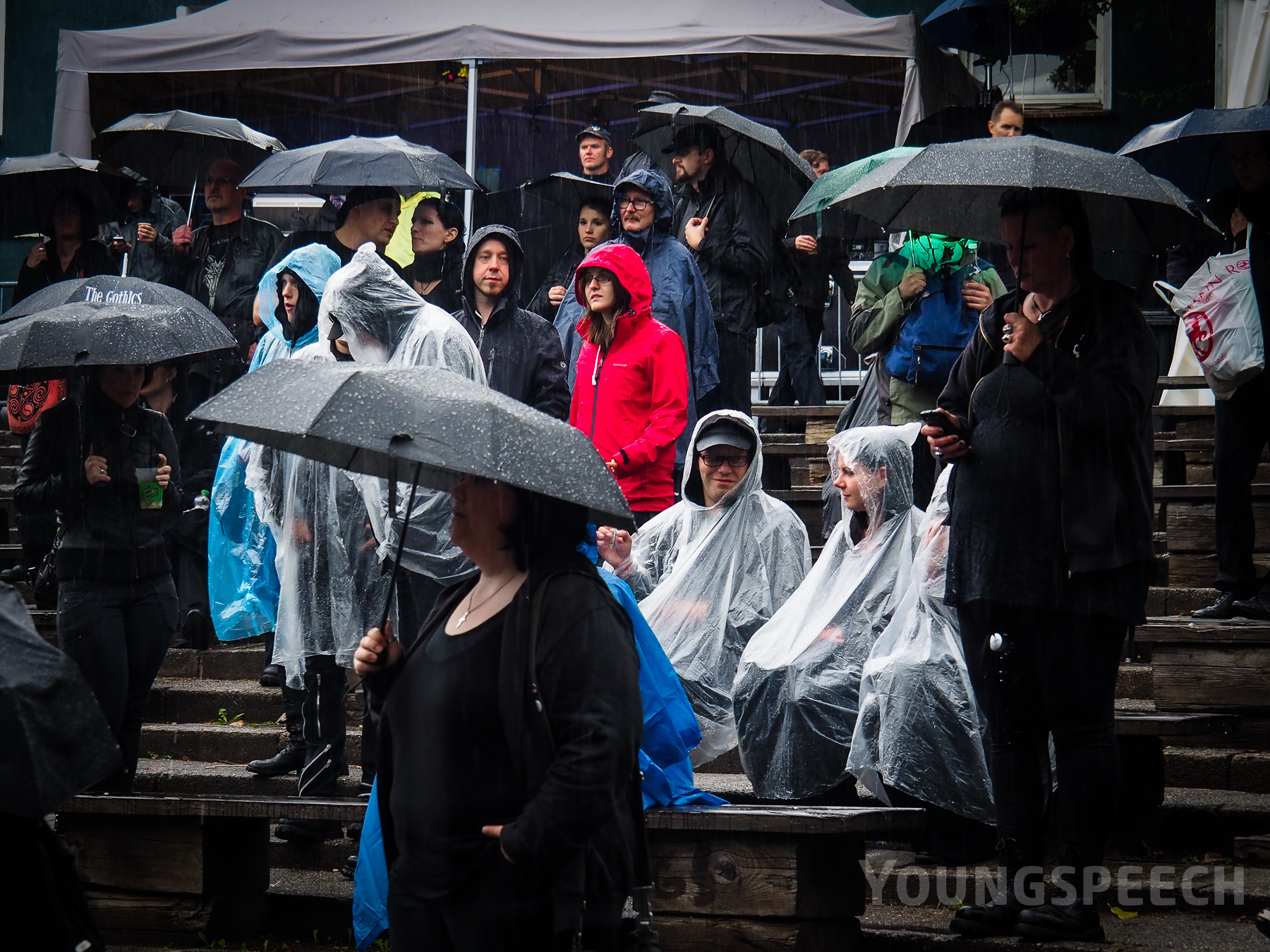 Auch diesjahr war ein zentrales Thema wieder Regen, jedenfalls ab dem Samstag. Ein Regenschauer, der dem des Vorjahres fast das Wasser reichen konnte (Achtung, der kommt flach!). Hier gab es dann wieder Gruppenkuscheln in den Unterständen, wohl dem, der einen Schirm mitbrachte. Die Bands ließen sich jedoch nicht beirre und spielten tapfer weiter, auch wenn Regen auf die Bühne peitschte.